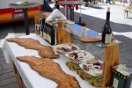 A few wineries and my daughter Josie involved, we loaded a van with Sangiovese reds, including a Brunello, a Vermentino white, a gorgeous little rosé from Tuscan grape varieties and a very special Pinot Noir from under the volcano. Further, a choice of pecorino cheese and cold cuts, several types of sott’olio (pickled vegetables), two types of native olive oil, a large bag of Tuscan bread, red wine jelly and chestnut honey to go with the cheese, plus all the necessary equipment to present it all to the public.